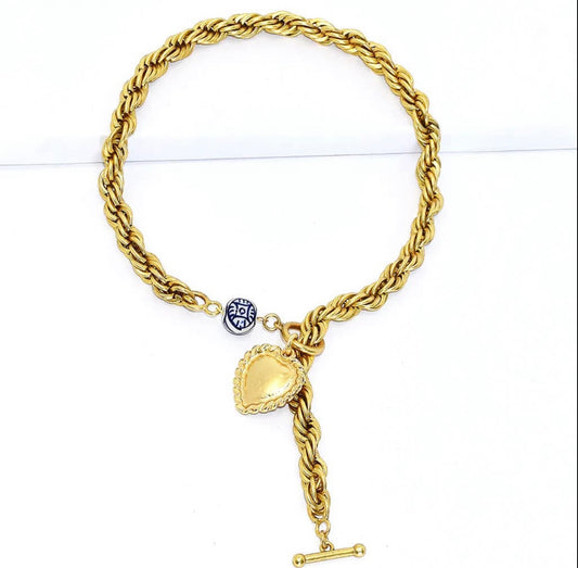 Twisted Rope Y Link Necklace with heart pendant and blue pearl accent