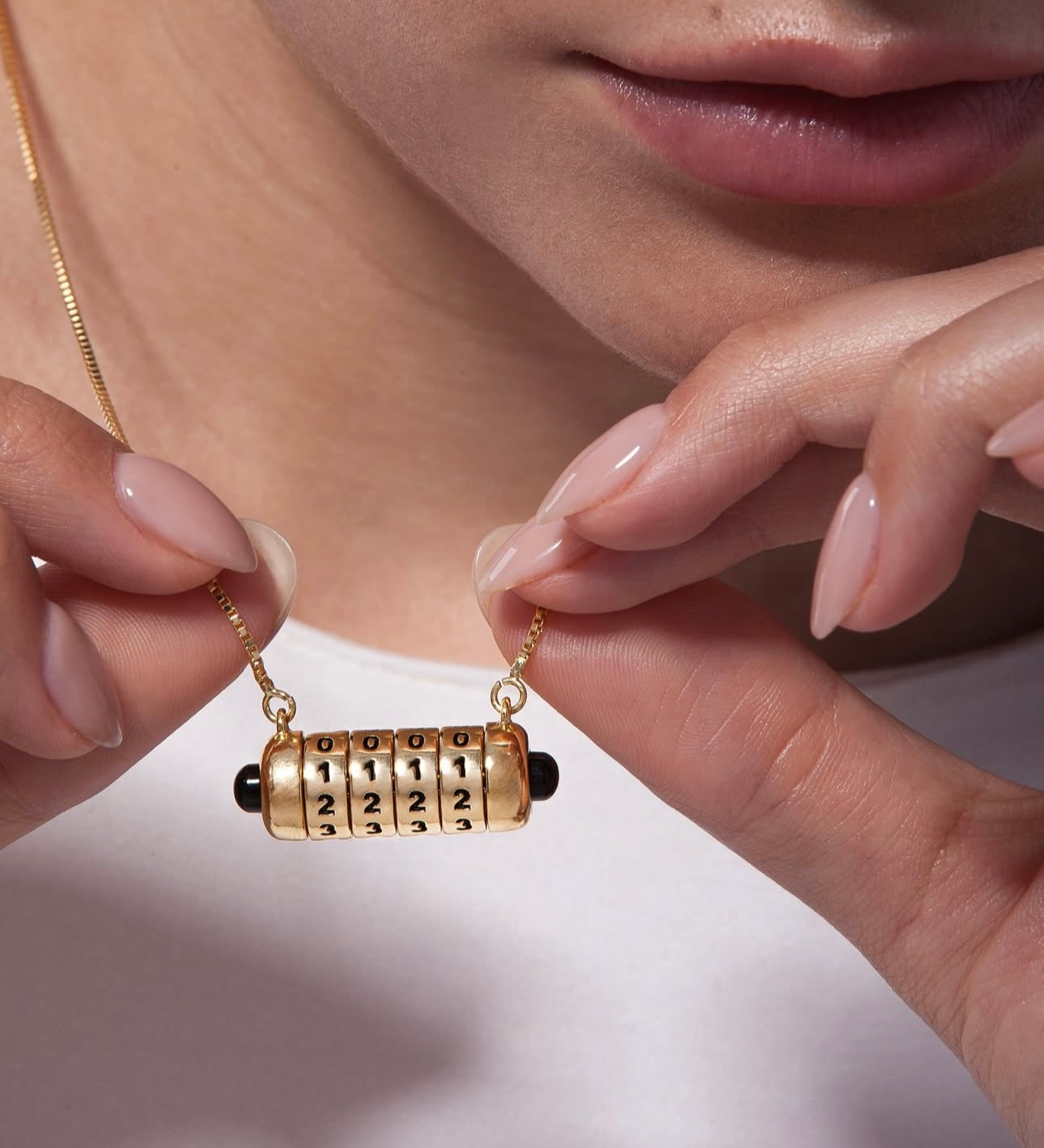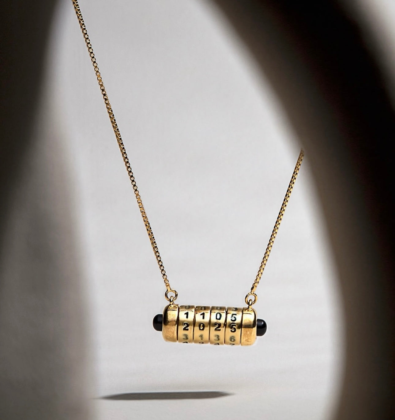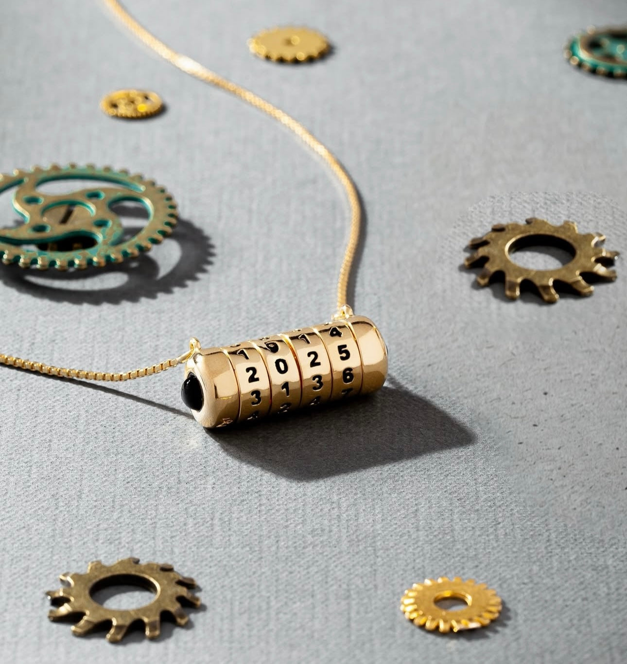 The Time Machine Necklace Maria Dolores blends innovative design with deeply personal meaning. Designed as a calendar, this piece allows you to highlight a special date or memory, featuring adjustable numbers that mark the moment you wish to eternalize.