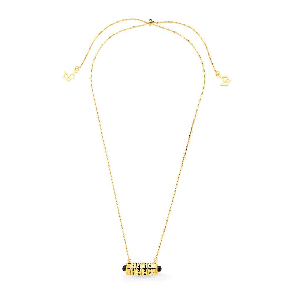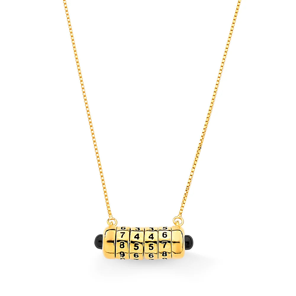 This long necklace, crafted with a Venetian chain plated in Gold, showcases a metal pendant with four rotating rings engraved with numbers, allowing you to choose and display your desired date. The pendant is adorned with Black Obsidian semi-spheres on the sides, adding an elegant and mystical touch.